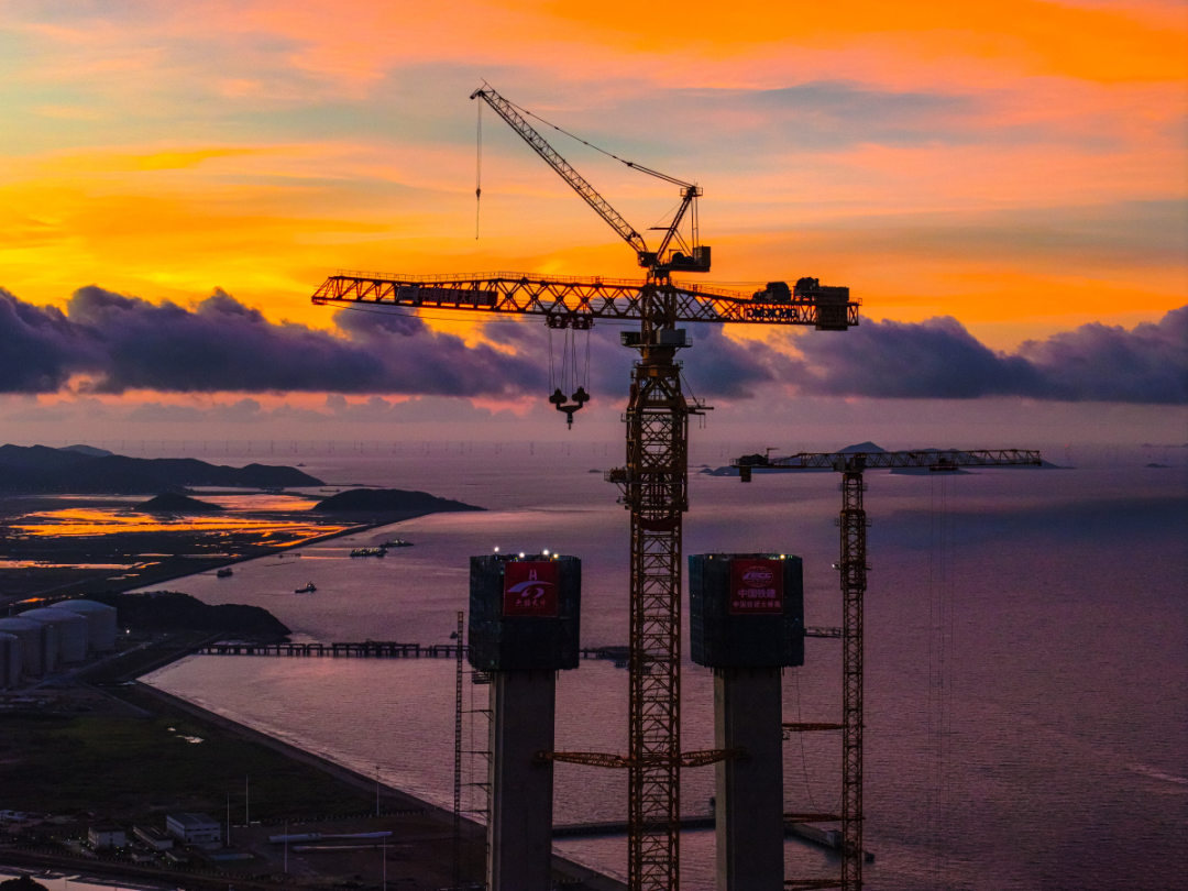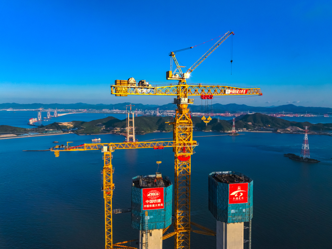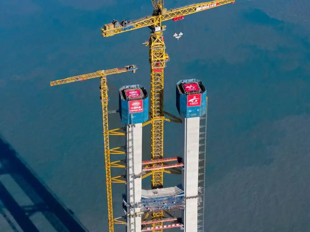 在封頂作業(yè)中,徐工塔機(jī)將百噸構(gòu)件以毫米級(jí)精度吊裝至200余米高空,硬剛10級(jí)海風(fēng),創(chuàng)造了海上橋梁建設(shè)新紀(jì)錄。多臺(tái)群塔協(xié)同作業(yè),創(chuàng)造性攻克"高空精度、抗風(fēng)穩(wěn)性、吊裝效率"三大世界級(jí)施工難題,展現(xiàn)了中國裝備的卓越性能。