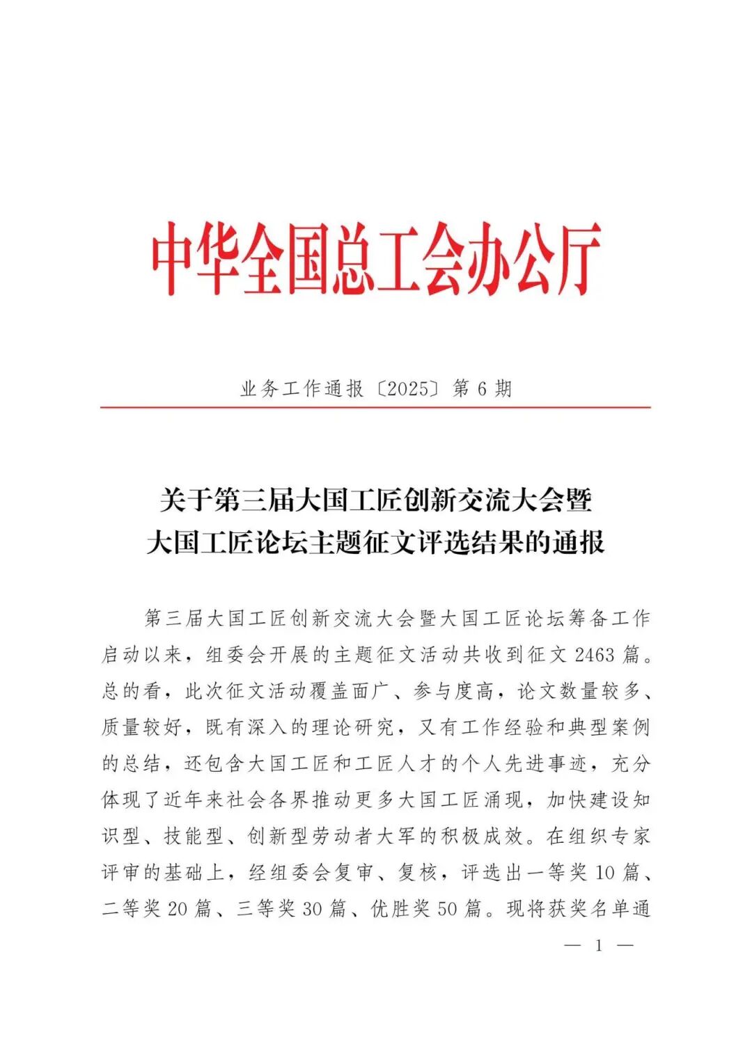 近日,由中華全國(guó)總工會(huì)主辦的第三屆大國(guó)工匠創(chuàng)新交流大會(huì)暨大國(guó)工匠論壇在重慶舉辦。大會(huì)集中展示大國(guó)工匠和廣大職工在推動(dòng)高質(zhì)量發(fā)展、發(fā)展新質(zhì)生產(chǎn)力中的卓越貢獻(xiàn)與創(chuàng)新成果,激勵(lì)億萬(wàn)職工在中國(guó)式現(xiàn)代化建設(shè)的偉大征程中再創(chuàng)佳績(jī)。