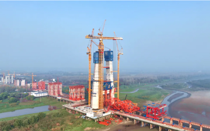 巢馬鐵路馬鞍山長(zhǎng)江大橋是世界最大跨度三塔斜拉橋,主塔總高345m。采用XGT15000-600S塔機(jī)進(jìn)行上部鋼塔柱施工吊裝僅需將鋼塔柱劃分為13個(gè)吊裝單元,最大單元重量超550t,較傳統(tǒng)施工方式效率提升65%以上。