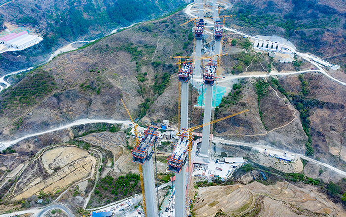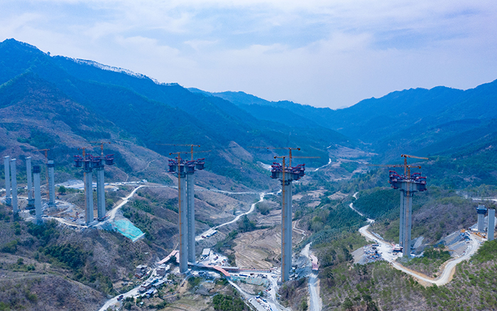 蒼翠延綿的群山深處,一根根百米高墩拔地而起,自東向西整齊排列,二十余臺(tái)徐工S1系列塔機(jī)、施工升降機(jī)與青山比肩,正有條不紊地吊裝,助力雅長(zhǎng)特大橋建設(shè)加速。