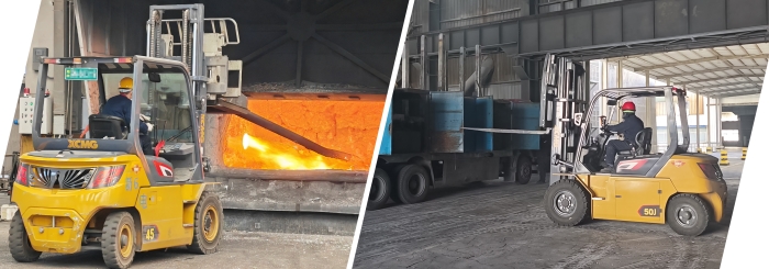 不止新疆,在華東某大型冶金廠,孔雀4.5噸叉車正在進行爐前作業(yè);在華南電解鋁行業(yè)的強磁車間內,5噸孔雀叉車在進行原材料搬運工作。