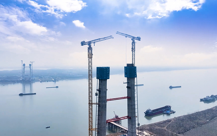 春和景明、碧波蕩漾,巍峨的武漢雙柳長江大橋北主塔正拔地而起,兩臺(tái)徐工XGT2230A-100S正高效精準(zhǔn)完成塔柱的拼裝,助力大橋北主塔加速建設(shè)。