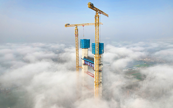 目前,兩臺(tái)徐工超大塔正在進(jìn)行大橋北主塔第26節(jié)施工,主塔以平均每周6米的速度迅速“節(jié)節(jié)長高”,高度已達(dá)144.5米,高效的施工效率贏得客戶高度稱贊。