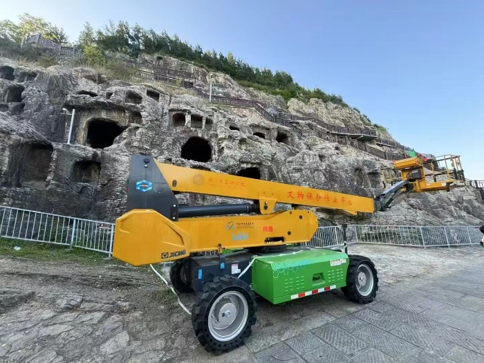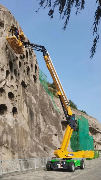 時間回溯到2021年,由于遭受多場暴雨侵襲,龍門石窟部分洞窟內(nèi)滲漏水嚴重甚至出現(xiàn)積水,部分山體表面巖石脫落、松動,嚴重威脅文物安全,急需得到有效治理。龍門石窟研究院隨即開展了為期1年多的“龍門石窟蓮花洞至石牛溪區(qū)域保養(yǎng)維護項目”。徐工XGS25ACK-Li直臂式高空作業(yè)平臺作為“得力助手”,深度參與各項保護修復(fù)工作。