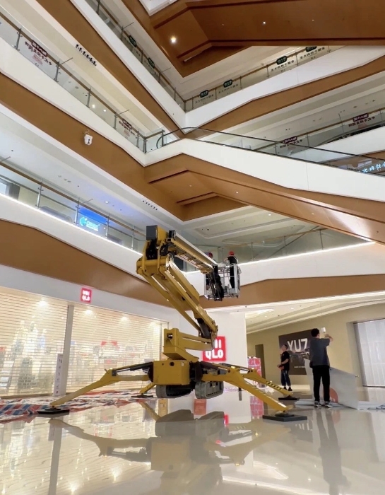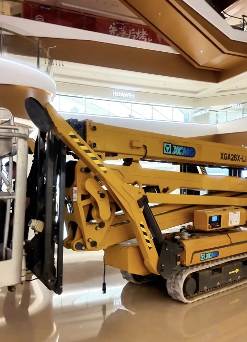 在杭州某大型商場,徐工XGS26X-Li將四只“蜘蛛腿”穩(wěn)穩(wěn)“扎根”在商場中庭,正在向玻璃圍欄下方的墻壁伸展臂架。超窄車身“溜”進(jìn)商場、伸縮臂架“瞄”準(zhǔn)墻面,這是徐工蜘蛛車在商場進(jìn)行維修保養(yǎng)的日常。而看似日常的施工,需要面對三關(guān)“難題”。