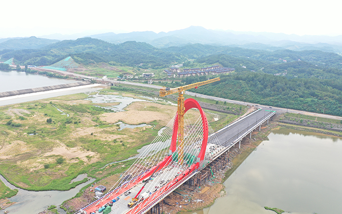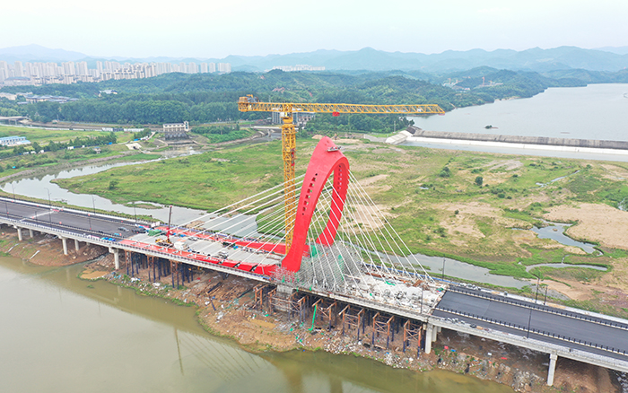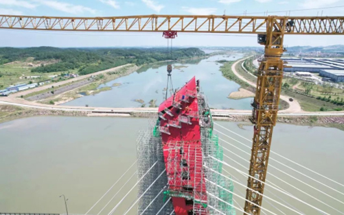 在大別山腹地、金寨縣史河河畔,“紅色搖籃”傲視遠方,徐工XGT2230-100S塔機揮舞著巨臂,隨著重達40噸的主橋鋼塔柱最后一個節(jié)段起吊安裝到位,金寨史河大橋主塔順利合龍。