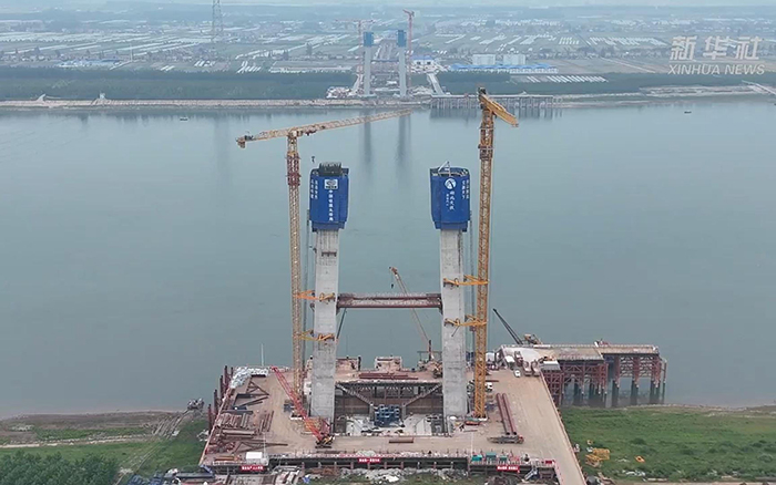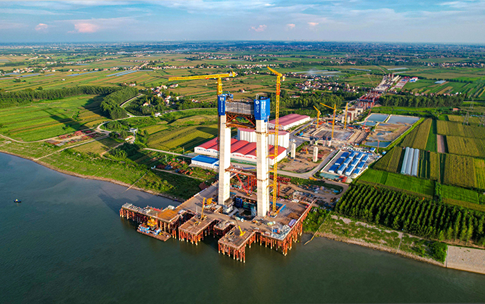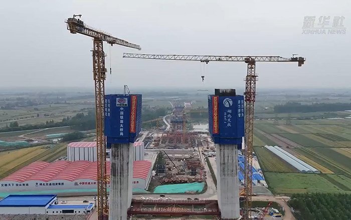 初秋時節(jié),長江之畔,兩臺徐工XGT600A-25S塔機鐵臂揮舞,助力荊州李埠長江公鐵大橋南岸主塔下游側(cè)第18節(jié)塔柱順利完成澆筑。